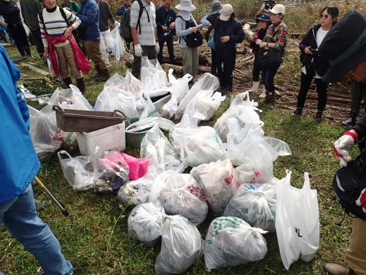 清掃活動では、皆さんヨシをかき分けながら漂着ごみを回収していました。また、法政大学の学生の皆さんが大型の粗大ごみなども回収してくれ、32袋分のごみと粗大ごみを回収することができました。